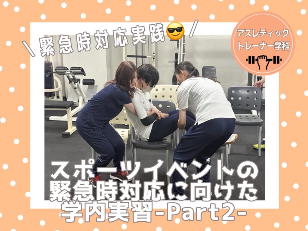 こんにちは!アスレティックトレーナー学科です💪✨前回に引き続き、緊急時対応に向けた学内実習の様子Part2をお届けします🙌🏻今回は「搬送」と「止血」の練習を行いました!🚑搬送練習:安全に、息を合わせて!搬送の練習では、オフコート救護を想定し、観客席の椅子からの搬送や、階段を使った搬送経路の確認などを行いました。搬送される人が安心・安全に移動できるように、2人1組で息を合わせて慎重に実践します🤝「チ