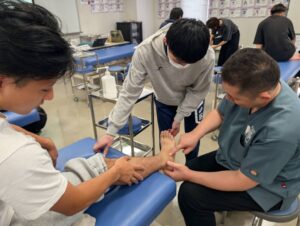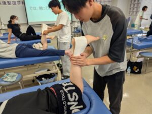 足関節捻挫で痛みが出やすい部位を確認しながら、正しい触診方法を一人ひとりが練習しました。