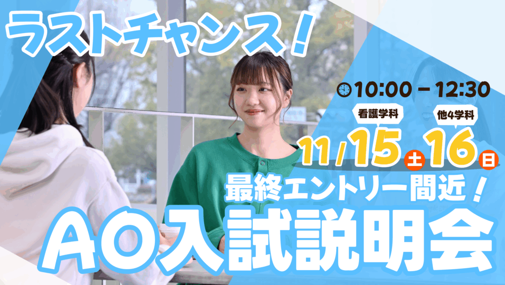2026年4月入学をご検討中の高校3年生・社会人・大学生・フリーターの方を対象に、『AO入試説明会』を開催いたします!👩「学校選びで迷っている」👨「今の仕事を続けるか、進学するか悩んでいる」👩「医療・スポーツ分野に挑戦してみたい」👨「学費や入試が不安…」そんな方にぴったりのイベントです💬AO入試受付終了まであとわずか!進路を決めるラストチャンス、ぜひご参加ください✨〰〰〰〰〰〰〰〰〰〰〰〰〰〰〰〰
